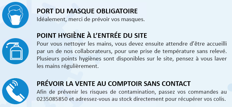 Nous sommes prêts pour la reprise et nous sommes heureux de pouvoir à nouveau vous accueillir, que ce soit pour un RDV commercial, une formation ou pour vos commandes au comptoir. Pour que votre visite se passe dans de bonnes conditions, nous avons mis en place un certain nombre de mesures. Nos locaux sont régulièrement désinfectés, des points hygiènes sont répartis un peu partout sur le site et une signalétique a été mise en place afin de garantir l’application des gestes barrières, des distances de sécurité, etc.